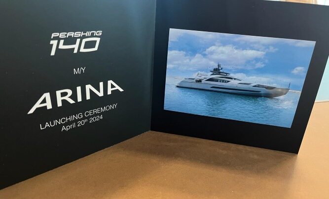 “It was a memorable day to be part of the christening and launch of “ARINA”, a 140′ Pershing Luxury Yacht, on Saturday April 20th, at the CRN Shipyard in Ancona, Italy. It’s an important naval tradition that’s both a celebration and a way of blessing a new build yacht.